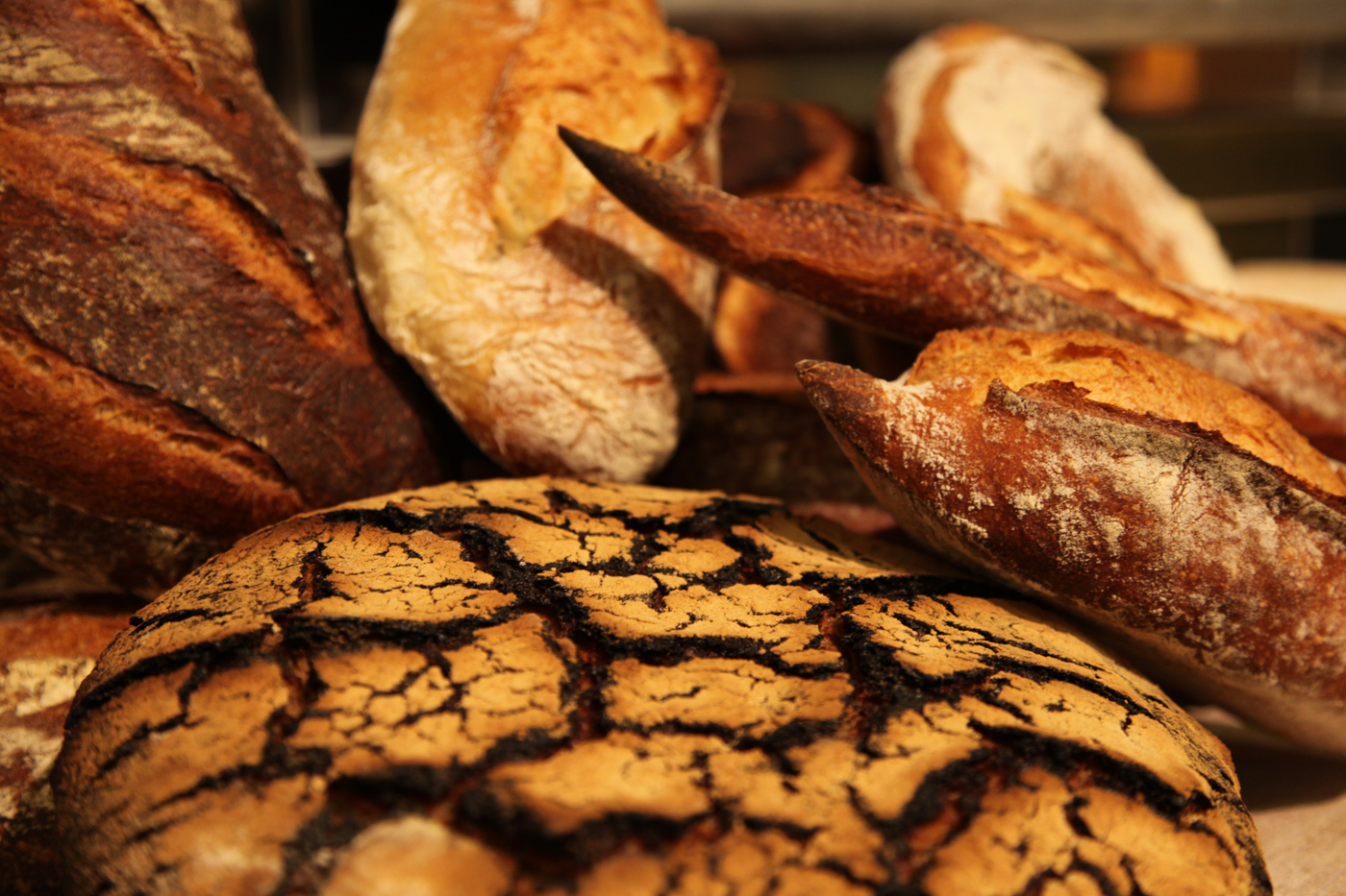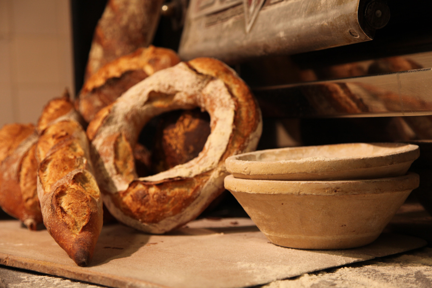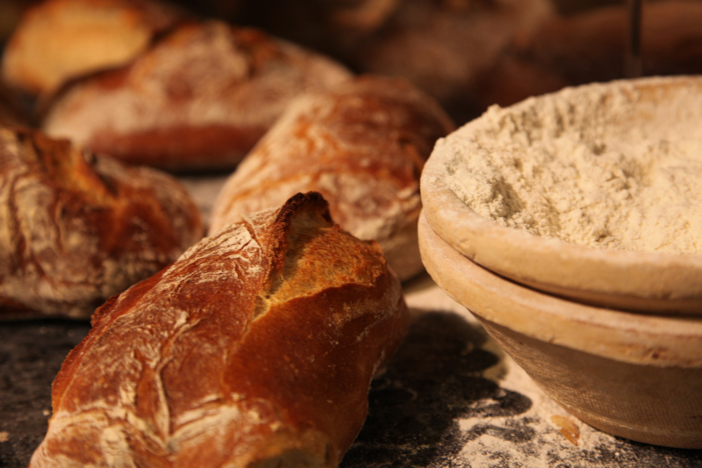 Tous nos pains sont fabriqués sur place avec des farines locales, du levain naturel maison entretenu, chaque jour, par nos boulangers, avec des fermentations longues de 24h minimum pour développer les goûts et les arômes.